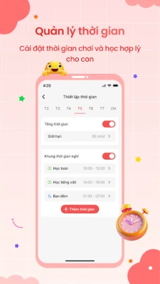 Với khả năng kiểm soát thời gian sử dụng thiết bị một cách thông minh, công cụ này cho phép cha mẹ thiết lập lịch trình học tập và nghỉ ngơi khoa học. Điều này không chỉ giúp bảo vệ đôi mắt khỏi tình trạng mỏi mệt mà còn tạo dựng một thời gian biểu cân bằng, đảm bảo con có đủ thời gian vui chơi và học tập hiệu quả. Đặc biệt, "Chế độ lớp học" sẽ tự động vô hiệu hóa các yếu tố gây xao nhãng trong giờ học, giúp con tập trung tối đa vào bài vở. Khi màn đêm buông xuống, "Chế độ ban đêm" sẽ tự động khóa thiết bị và mở lại vào buổi sáng, khuyến khích giấc ngủ đủ giấc và lành mạnh.
